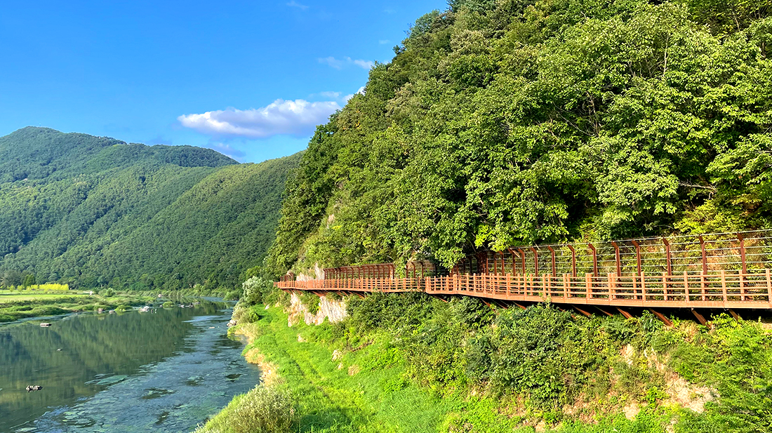 바위공원을 지나 평창강을 따라 나무데크로 조성된 평화길에 이르면, 평창을 둘러싼 산과 흐르는 평창강을 감상하며 평화롭게 걸어갈 수 있습니다. 이곳은 도심의 소음과 붐비는 분위기와는 다른 조용하고 평온한 분위기를 제공합니다. 계절마다 바꾸는 산의 모습과 강물의 흐름은 관람자에게 즐거움을 선사합니다. 코스모스 밭이나 출렁다리와 같은 다양한 장소는 산책을 더욱 풍부하게 만들어주고, 포토존은 사랑하는 이와의 소중한 추억을 남길 수 있는 기회를 제공합니다. 이곳은 붐비지 않아 주변을 신경쓰지 않고 사랑하는 이들과의 소중한 시간을 보낼 수 있는 완벽한 장소입니다.