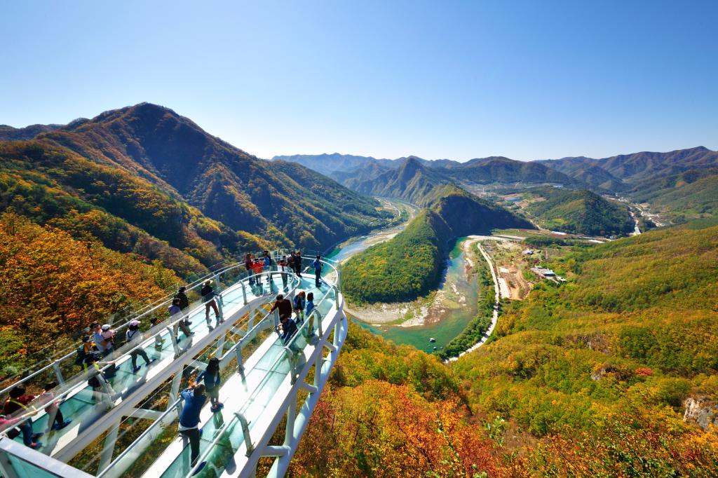 병방치 스카이워크는 정선읍에서 가까워 한반도 지형을 닮은 동강변의 아름다운 풍경을 감상할 수 있는 곳입니다. 강변 583m 절벽 끝에 설치된 길이 11m의 U자형 유리전망대에서 마치 구름 위를 걷는 듯한 아찔한 느낌을 줍니다. 아라힐스 리조트 시설로 유료이며, 20인 이상 단체 방문 시 10% 할인이 적용됩니다. 주말과 공휴일에는 주차장 이용이 어려울 수 있어 셔틀버스를 추천합니다. 이곳은 정선5일장과 가까워 정선 여행에서 빼놓을 수 없는 명소입니다. 또한, 짚와이어를 통해 짜릿한 체험도 가능합니다.