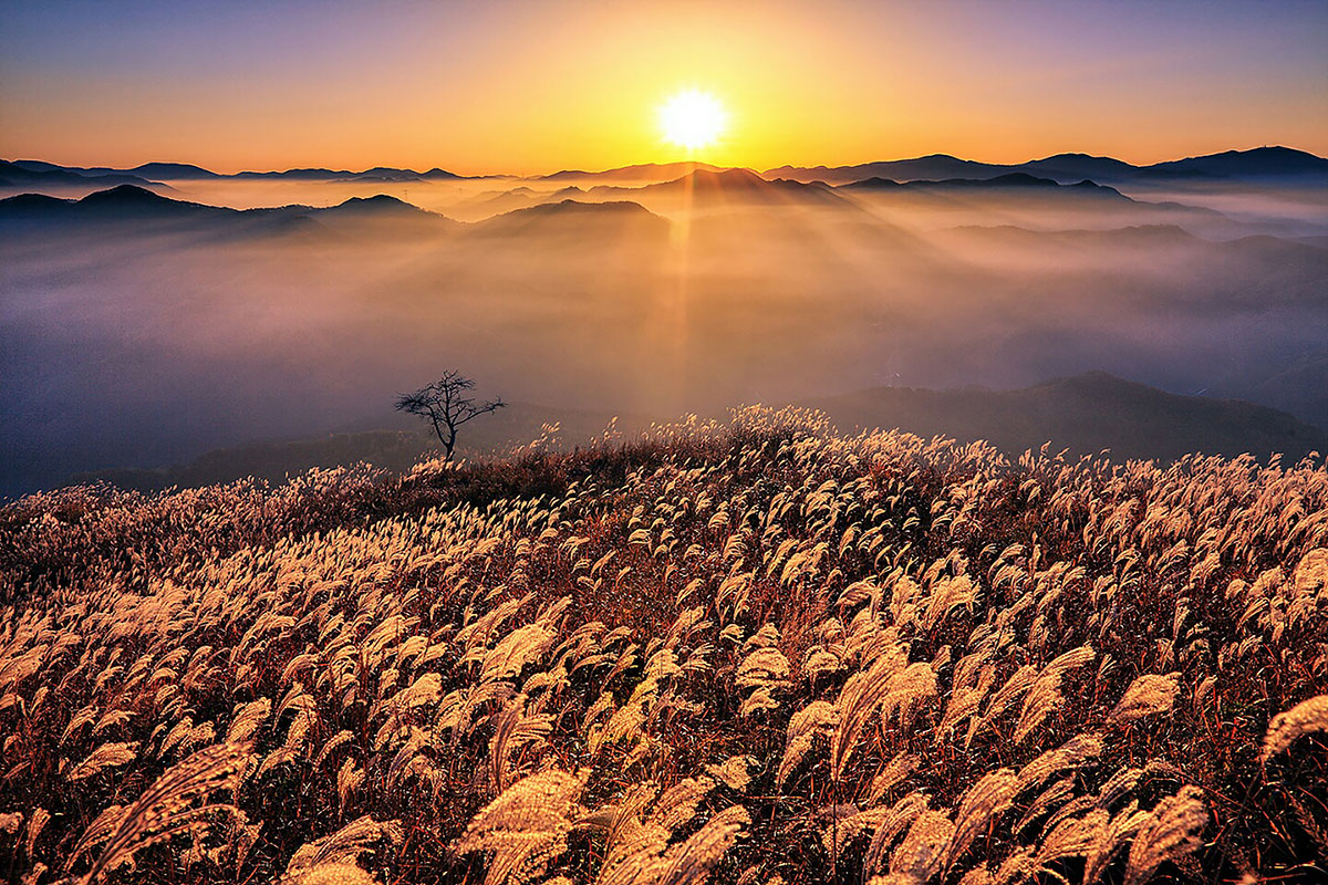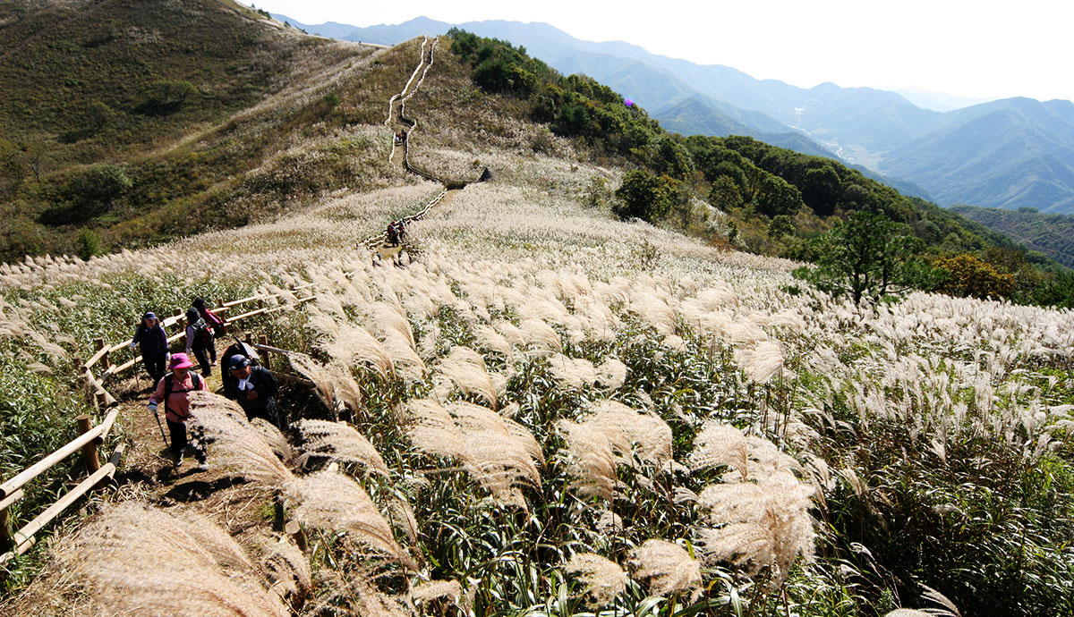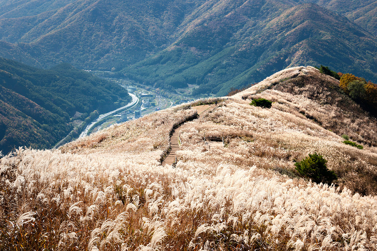 등산로는 잘 정비되어 있어 오르기 쉬우며, 일반적으로 증산초등학교 앞에서 산행을 시작합니다. 완만한 3.2km 코스와 가파른 2.6km 코스를 선택할 수 있으며, 어느 쪽이든 2시간 이내에 등반이 가능합니다. 능선에 이르면 울창한 숲과 함께 시원한 바람이 이마에 맺힌 땀을 식혀줍니다. 7부 능선을 넘으면 나무가 거의 없는 구릉지가 펼쳐지며, 황금빛으로 물든 억새밭에서는 아련한 슬픔마저 느껴집니다. 가을철 억새 산행을 계획 중이라면, 정선 민둥산을 추천드립니다.