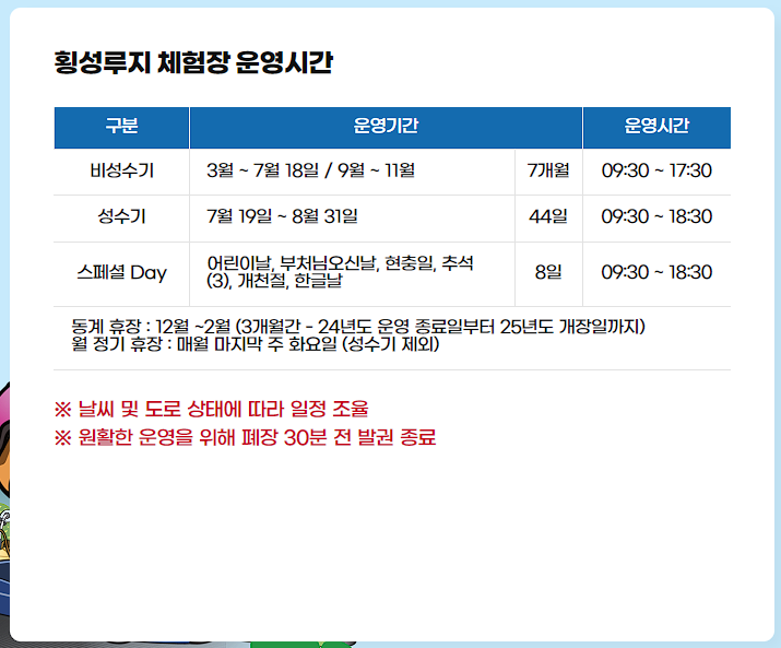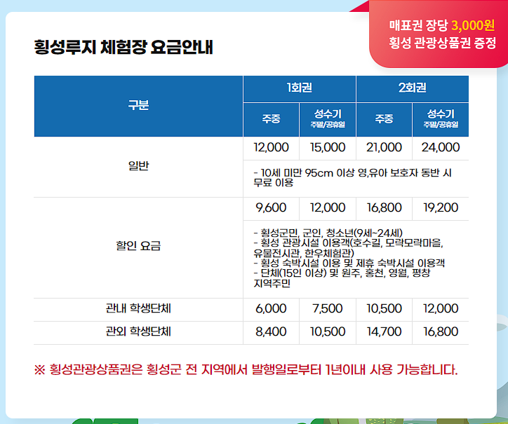 | ✅ 횡성 루지체험장 안내 주소 : 강원 횡성군 우천면 전재로 407 문의 : 033-342-5503 운영시간 : 위의 표 참고 이용료 : 위의 표 참고 (매표권 장당 횡성 관광상품권 3,000원 증정) 주차 : 무료(넓음) |