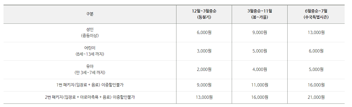 | ✅ 아일랜드 리솜오아식스 선셋스파 안내 / 자세한 안내 클릭 ⬅️⬅️ 주소 : 충남 태안군 안면읍 꽃지해안로 204 문의 : 041-671-7060 운영시간 : 스파 10시~20시 / 사우나 6시~21시 이용료 : 스파 : 대인 40,000원, 소인 30,000원 / 사우나 : 대인 12,000원, 소인 8,000원 주차 : 무료 |