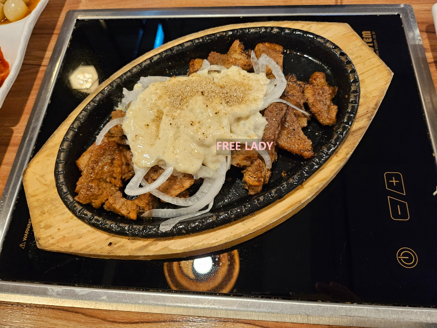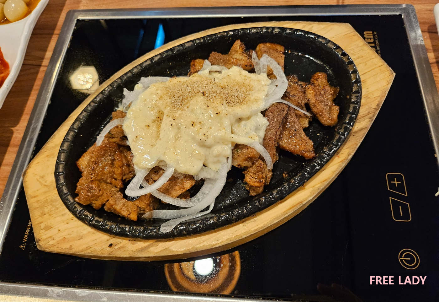 마늘 석갈비는 돼지고기 위에 양파와 새콤한 소스가 단짠의 조화를 이루는 맛이었어요.