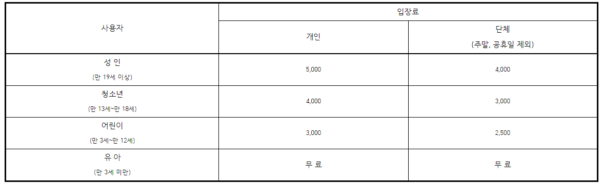 - 어른(5,000원), 청소년,군인(4,000원), 어린이(3,000원), 6세미만(무료)