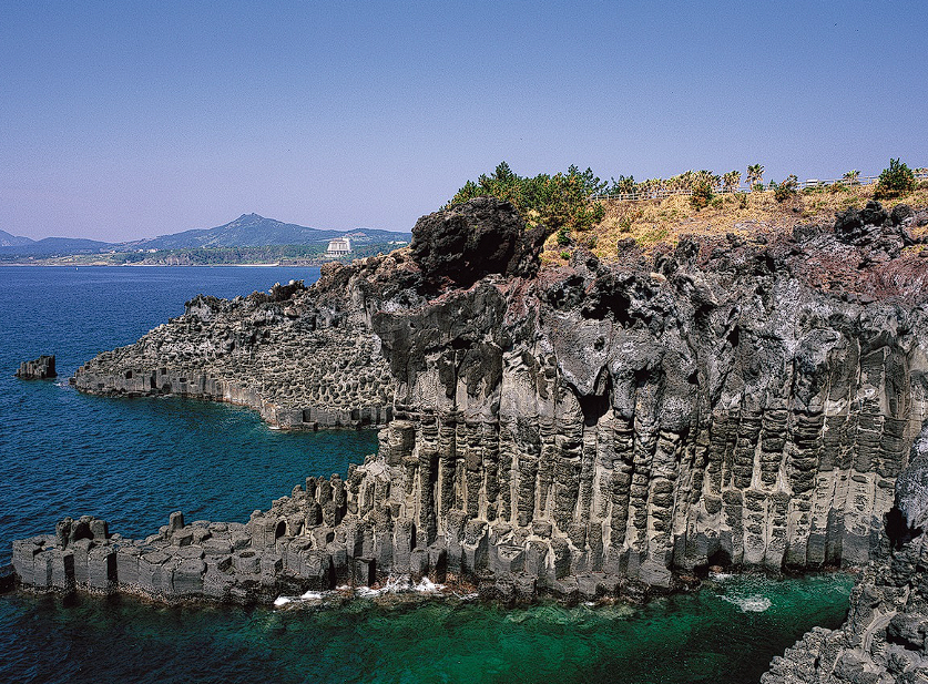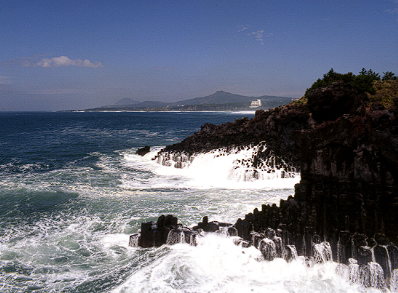 주상절리는 마치 예리한 조각 칼로 깎아낸 듯한 4~6각형 형태의 기둥으로, 현무암질 용암이 급격히 식으면서 형성된 수직 절리입니다. 계단처럼 겹겹이 쌓인 육모꼴 돌 기둥들이 병풍처럼 둘러져 있어 자연의 신비로움을 만끽할 수 있습니다. 기둥에 부딪히는 파도는 때로는 높이 20m 이상 치솟아 멋진 장관을 연출합니다. 중문·대포해안 주상절리대는 높이 30~40m, 폭 약 1km정도로 우리나라 최대 규모를 자랑하며, 제주도 천연기념물 제443호로 지정되어 있습니다.