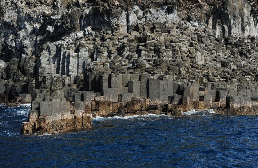 주상절리는 마치 예리한 조각 칼로 깎아낸 듯한 4~6각형 형태의 기둥으로, 현무암질 용암이 급격히 식으면서 형성된 수직 절리입니다. 계단처럼 겹겹이 쌓인 육모꼴 돌 기둥들이 병풍처럼 둘러져 있어 자연의 신비로움을 만끽할 수 있습니다. 기둥에 부딪히는 파도는 때로는 높이 20m 이상 치솟아 멋진 장관을 연출합니다. 중문·대포해안 주상절리대는 높이 30~40m, 폭 약 1km정도로 우리나라 최대 규모를 자랑하며, 제주도 천연기념물 제443호로 지정되어 있습니다.