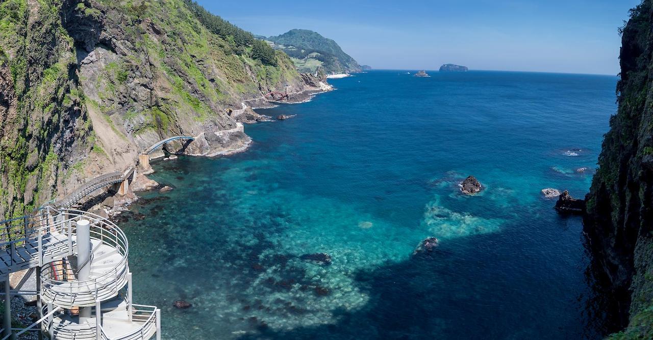 주상절리로 절개된 구간은 구름다리와 일반다리 7개(빨, 주, 노, 초, 바, 랑, 보)로 해상과 육상을 연결하여 울릉도의 멋진 풍경을 감상할 수 있게 했습니다. 울릉읍 도동방향에 있는 직벽 높이 54m의 소라 계단을 올라가면 지나온 다리와 바다를 한눈에 조망할 수 있습니다. 이곳은 개통 이후 관광객들에게 큰 인기를 끌었으며, KBS2 인기 프로그램 1박2일에서도 두 차례나 촬영, 방영되어 울릉도 내에서 가장 핫한 관광지로 자리잡았습니다.