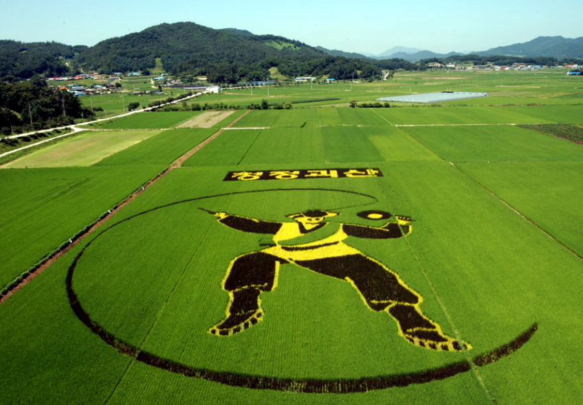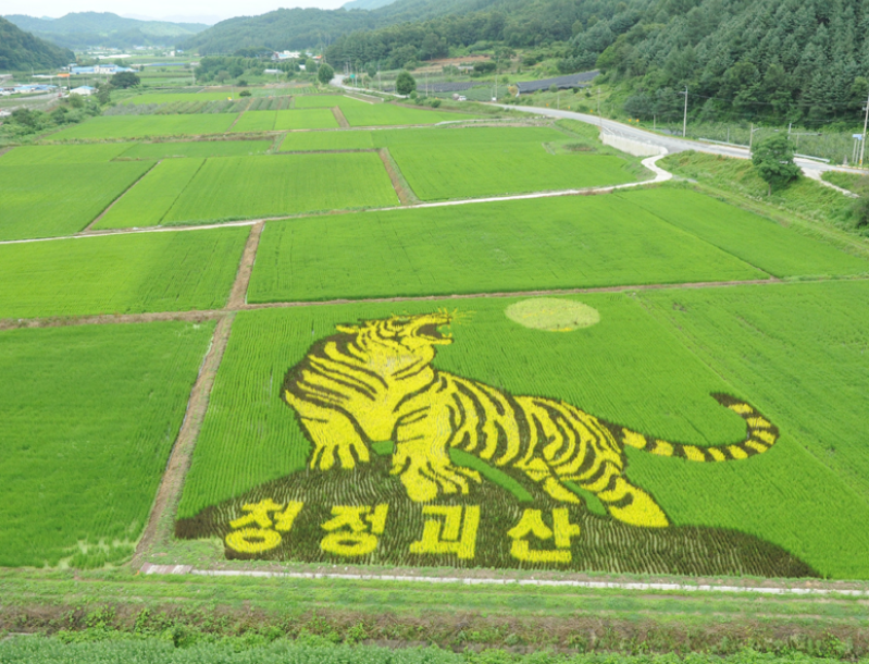 괴산군에서는 매년 논을 캔버스로 삼아 유색벼로 그림을 그리는 특별한 행사를 진행하고 있습니다. 올해는 17번째로, 지난해보다 두 배 넓은 1㏊ 면적에 용 그림을 조성해 행운과 풍년을 기원했습니다. 이 작품은 괴산군 농업기술센터와 청년농업인들이 함께 참여해 완성했으며, 벼가 자라면서 색이 변화하는 모습도 또 다른 볼거리입니다. 특히 7월 하순부터는 벼의 고유 색상이 절정에 이르러 더욱 아름답게 감상하실 수 있습니다.