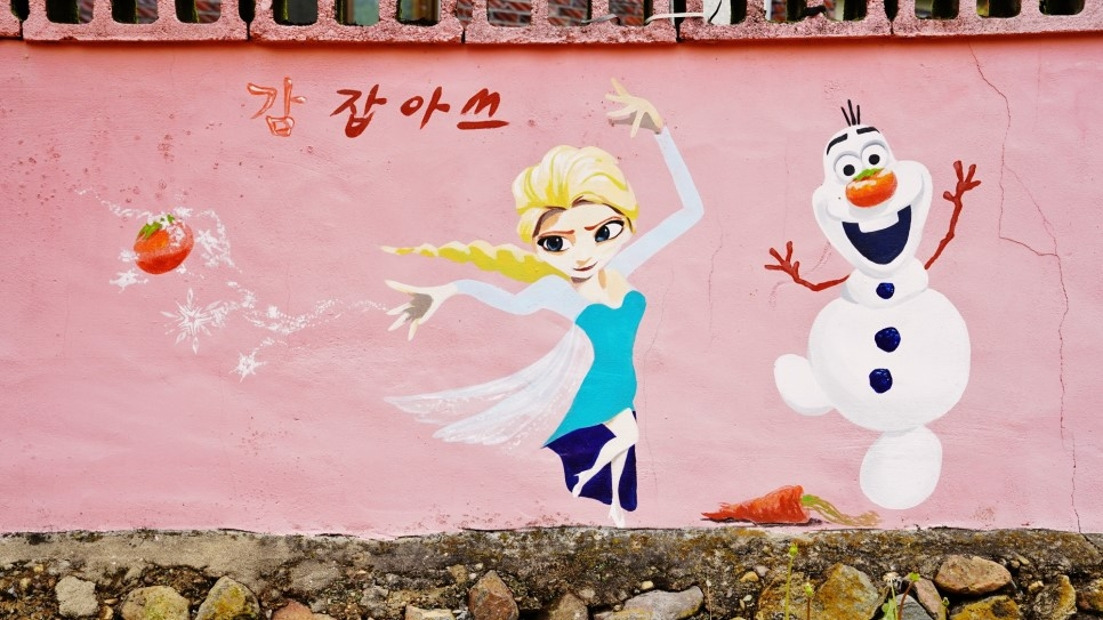 남성현역 주차장 앞에 위치한 다도리벽화마을은 2016년 반시벨리 벽화마을로 조성되었습니다. 청도의 특산물인 씨앗 없는 반시에서 이름을 따온 이 마을은, 주민들의 삶의 이야기와 가훈 등을 재치 있는 그림으로 담아내고 있습니다. 벽화 앞에서는 천사가 되어보거나, 겨울왕국의 엘사가 익살스럽게 감을 던지는 사진을 찍을 수 있는 포토존도 마련되어 있습니다. 청도 감꽃길 제1코스인 남성현역에서 시작해 다도리벽화마을, 떼루아 드라마 세트장, 청도와인터널까지 가볍게 걸으며 즐기기 좋은 코스입니다.