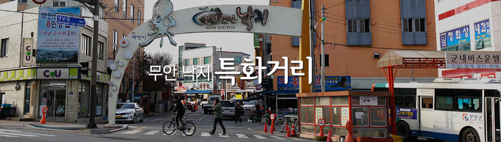 무안읍 버스터미널 인근의 골목에 조성된 '낙지특화거리'는 낙지를 판매하는 노점상과 점포들이 즐비한 거리입니다. 무안군은 이곳에 지상 3층, 연면적 1,957㎡ 규모의 낙지골 주차타워를 마련하여 약 80대 주차가 가능하고, 먹거리 관광객을 유치하며 낙지브랜드 사업도 추진하고 있습니다. 거리에는 약 20여 개 점포가 있으며, 기절낙지, 낙지회무침, 낙지연포탕, 낙지비빔밥 등 다양한 낙지 요리를 맛볼 수 있습니다.
