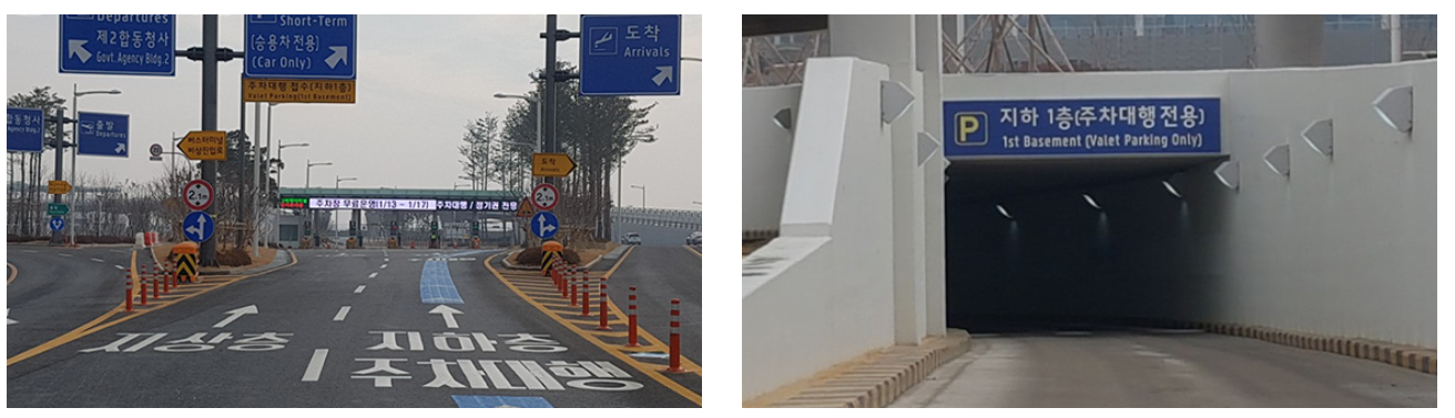 터미널 진입시 주차대행 전용차선으로 진입 (파란색 바닥라인 표시)