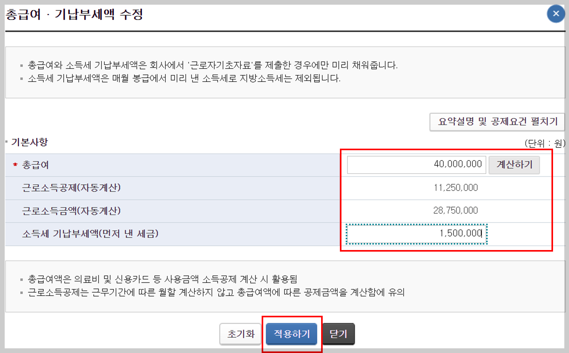 ▶ 총급여액과 소득세 기납부세액(먼저 낸 세금) 입력 - 적용하기 클릭합니다. (금액은 대충 입력함..)