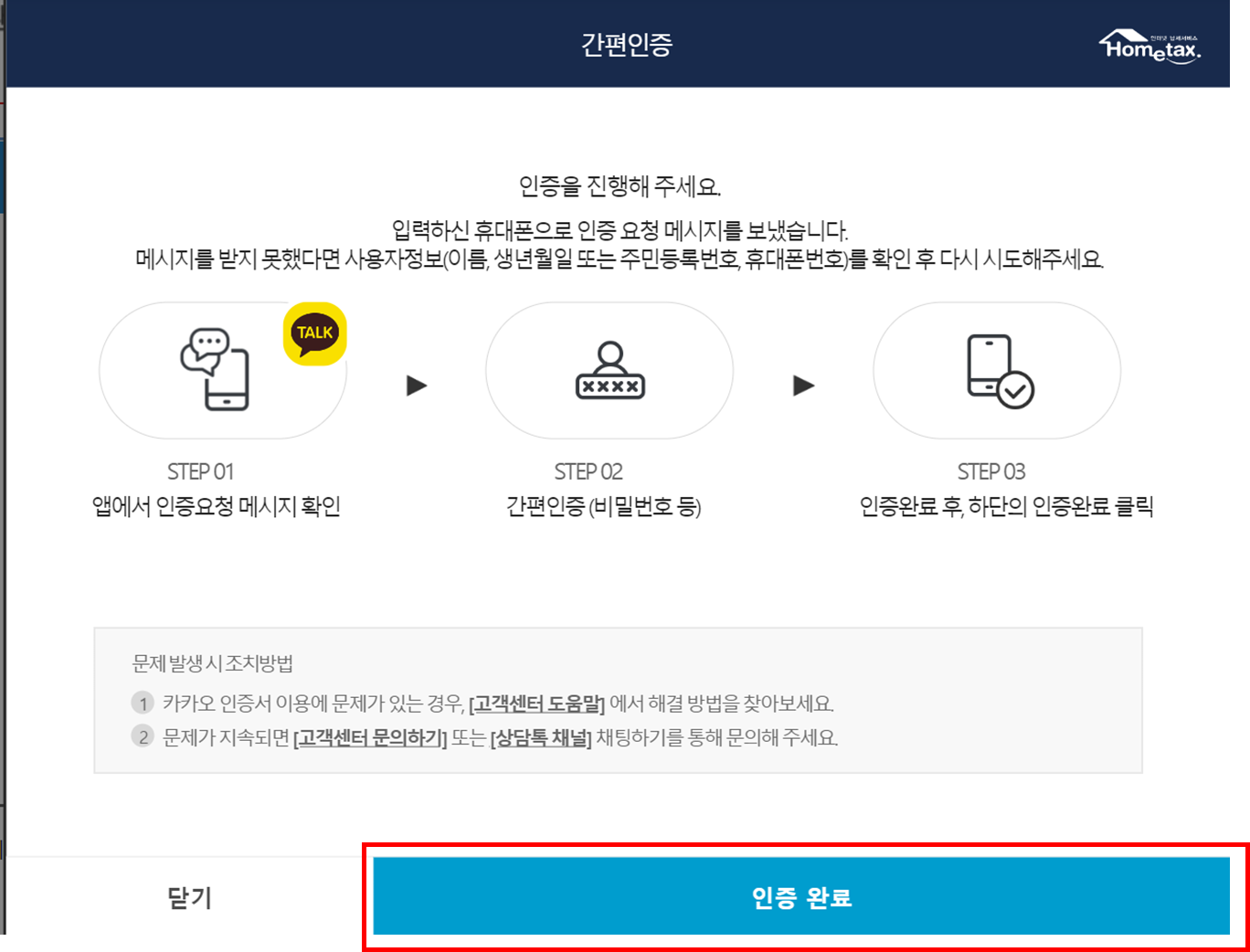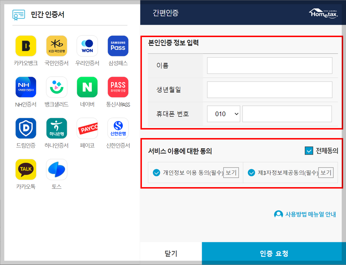 ▶ 본인인증 정보 입력 - 전체동의 - 핸드폰으로 온 메세지로 인증 완료 - 홈택스 화면의 인증 완료 클릭합니다.