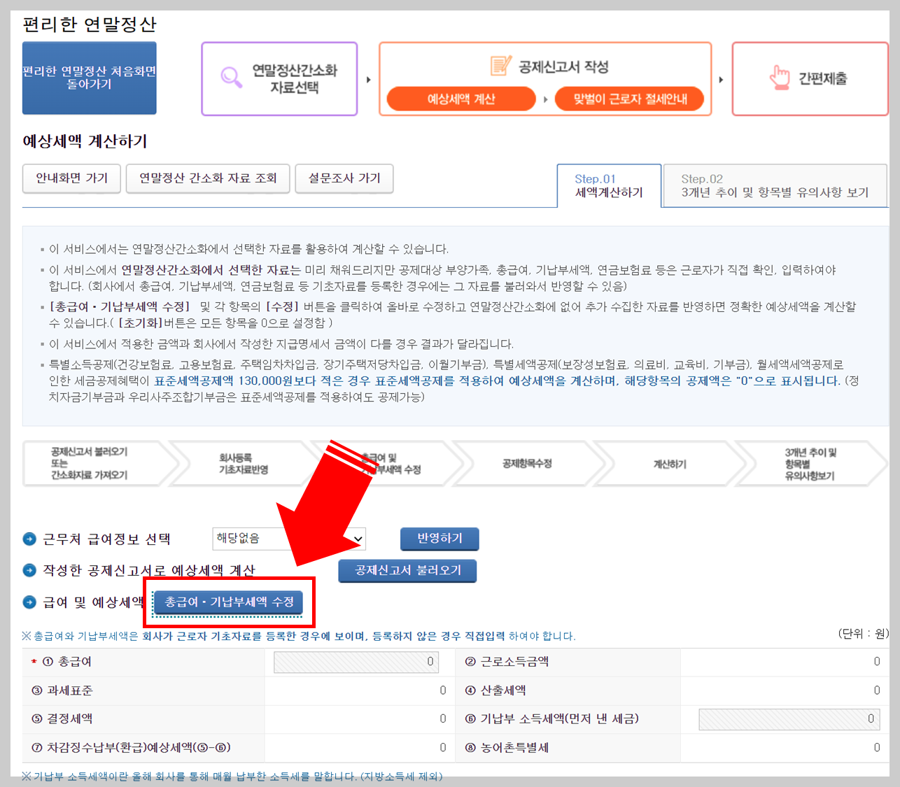▶ 급여 및 예상세액 - 총급여 · 기납부세액 수정 클릭합니다.
