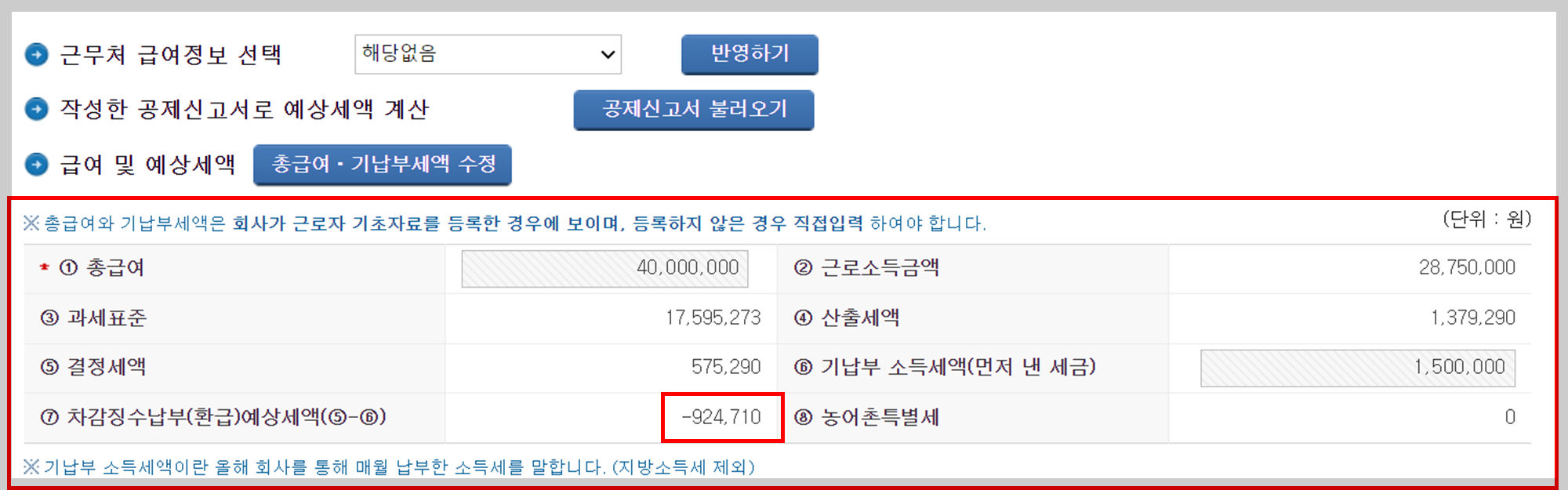 (총급여와 기납부세액을 정확하게 입력하면 비슷하게 나오나 예상금액임을 참고 해주세요)
