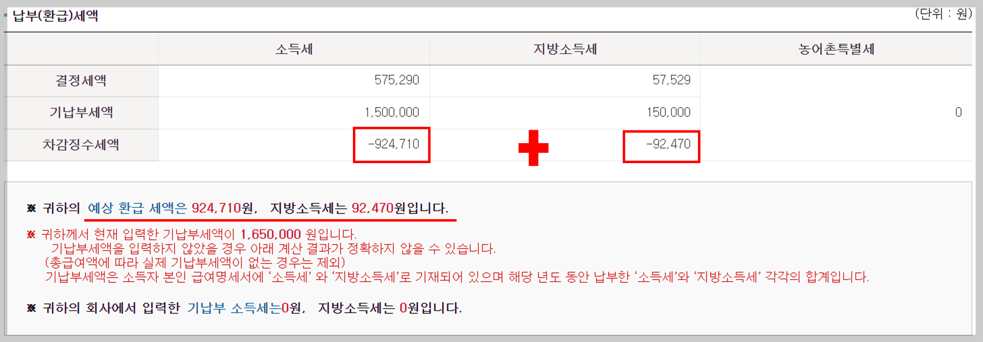 ▶ 소득세 + 지방소득세를 더한 금액이 내가 환급 받을 총 금액입니다.