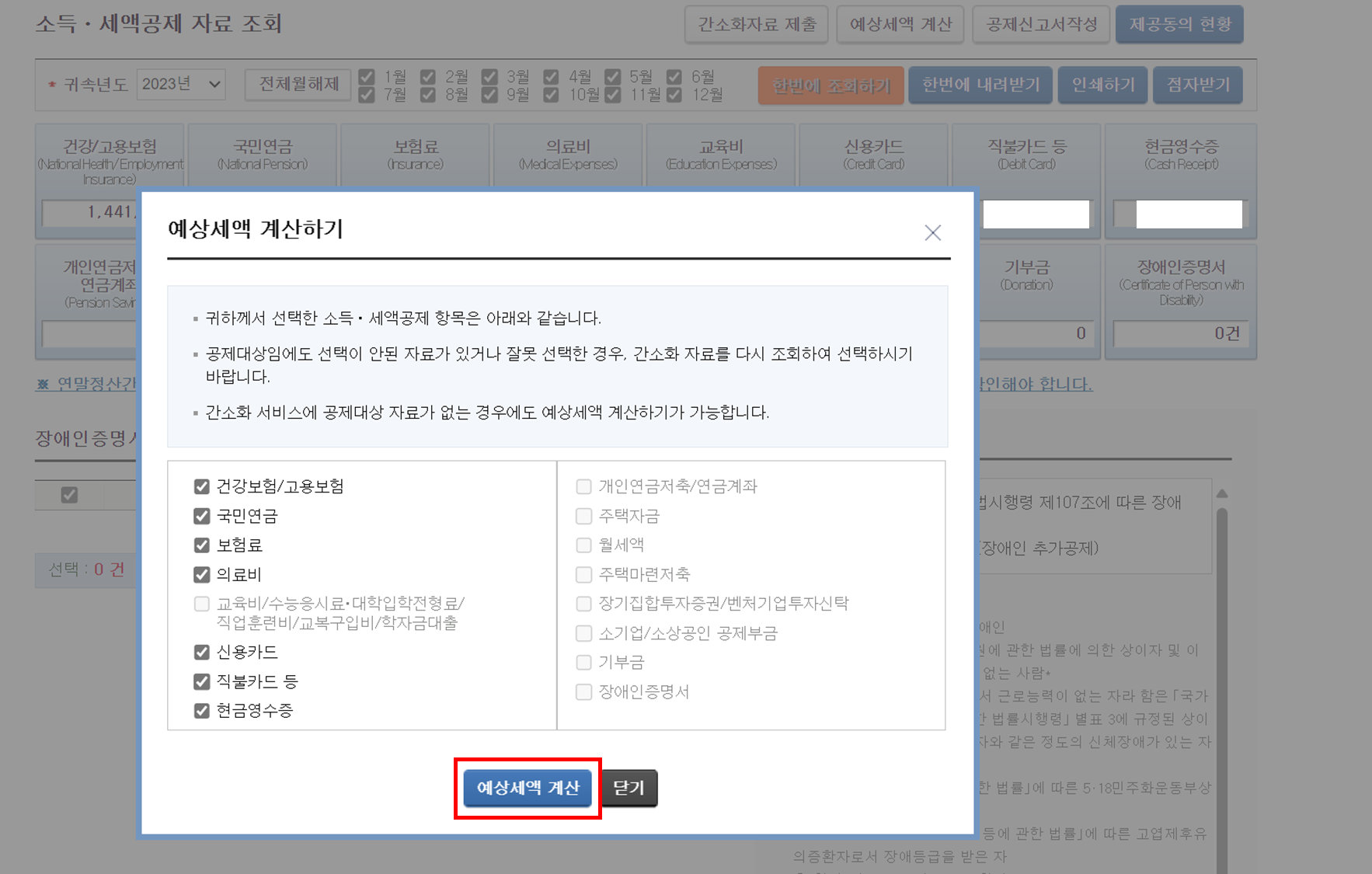 ▶ 예상세액 계산하기 - 클릭합니다. (해당 항목에 체크가 되어 있습니다.)