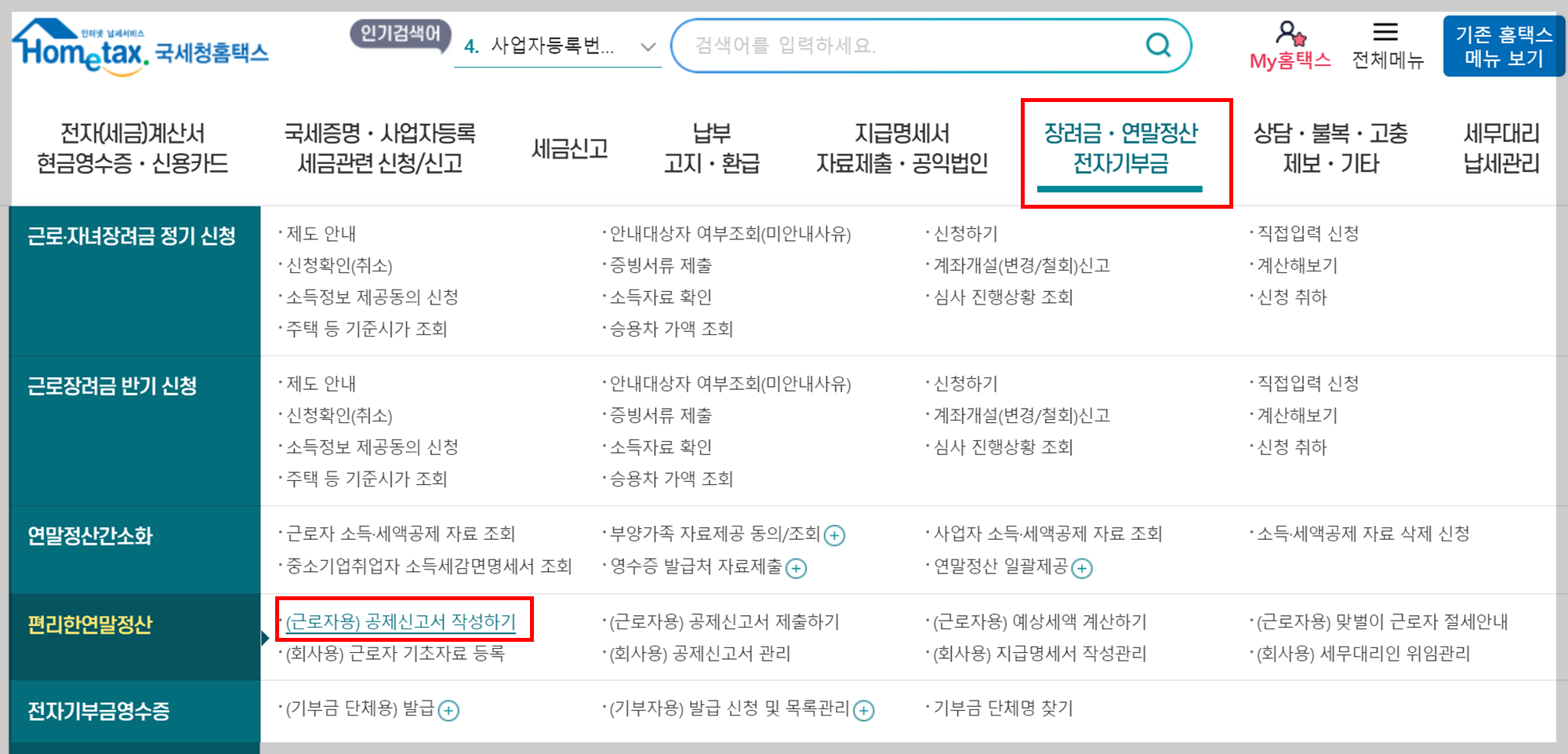 ▶ 장려금 · 연말정산 · 전자기부금 - (근로자용) 공제신고서 작성하기 클릭
