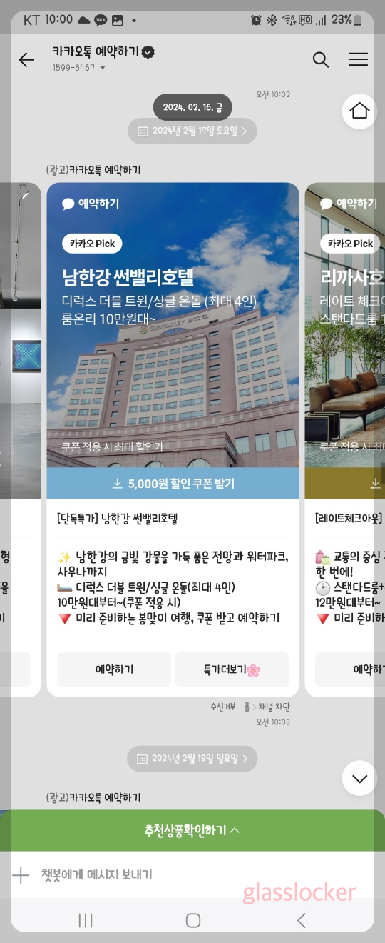 저도 카톡 예약하기에 남한강 썬밸리호텔을 보고 별 생각 없다가