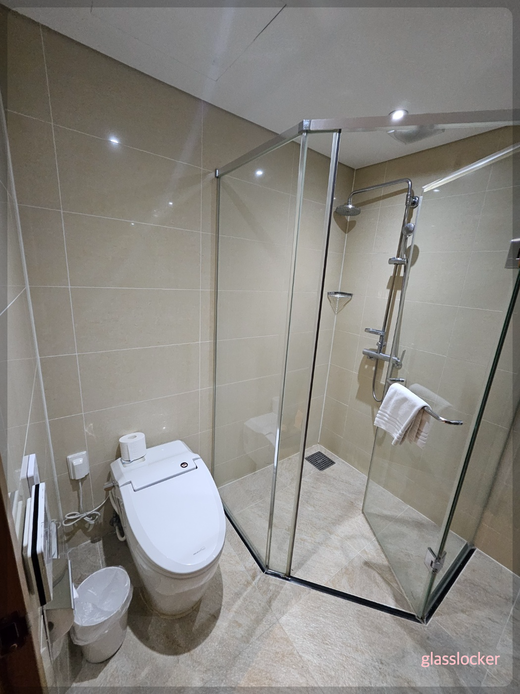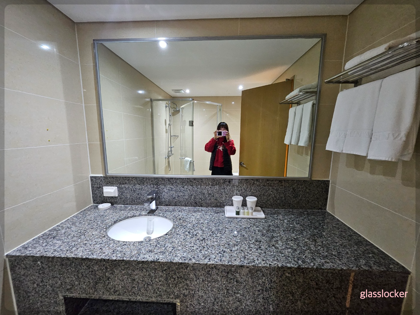 수건은 보통사이즈 3개와 큰사이즈 1개, 샤워실 들어가는 손잡이에 있는 수건은 아마도 발매트!