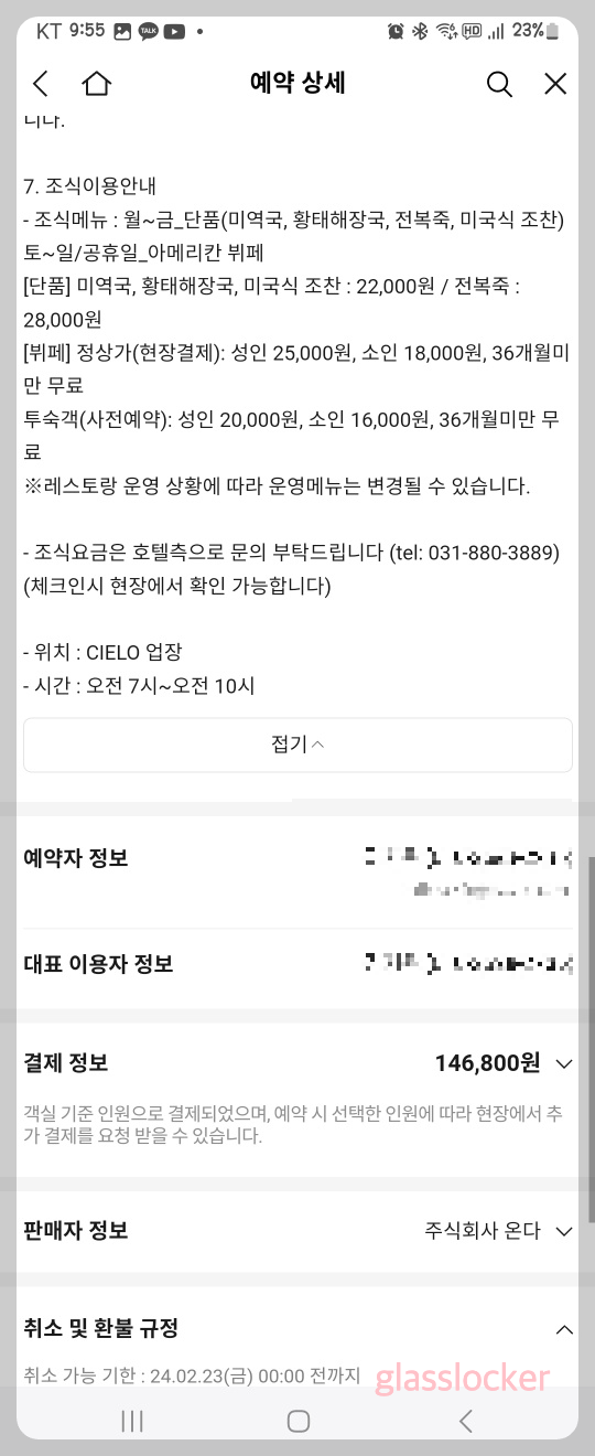 - 숙박비 : 조식 PKG (객실+조식2인) 146,800원