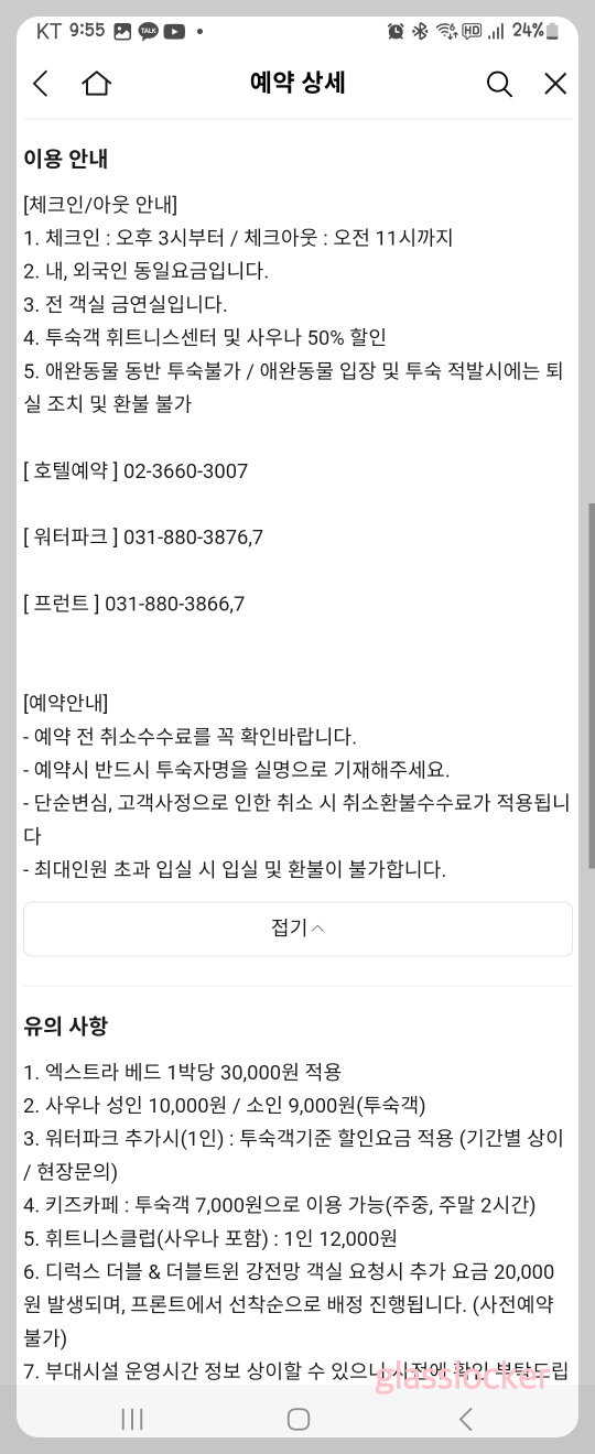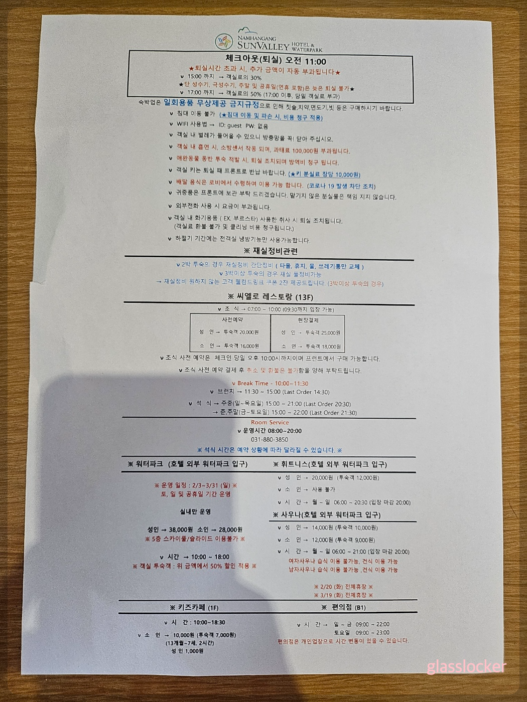 - 투숙객(사전예약) : 성인 (20,000원), 소인 (16,000원), 36개월 미만 (무료)