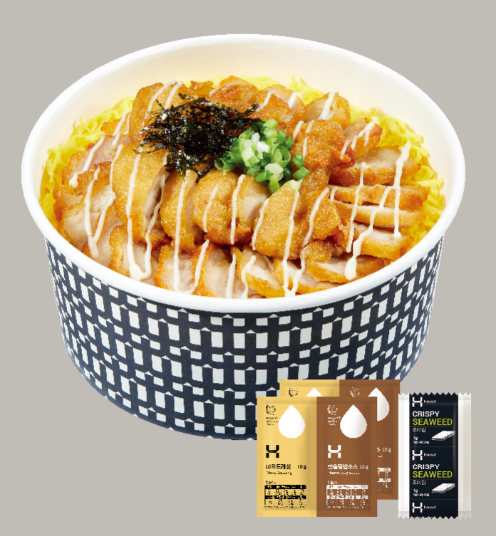- 메가치킨마요 : 흰밥위에 한 입 크기로 자른 슬라이스 치킨 가라아게 + 마요드레싱 + 덮밥소스 + 조미김