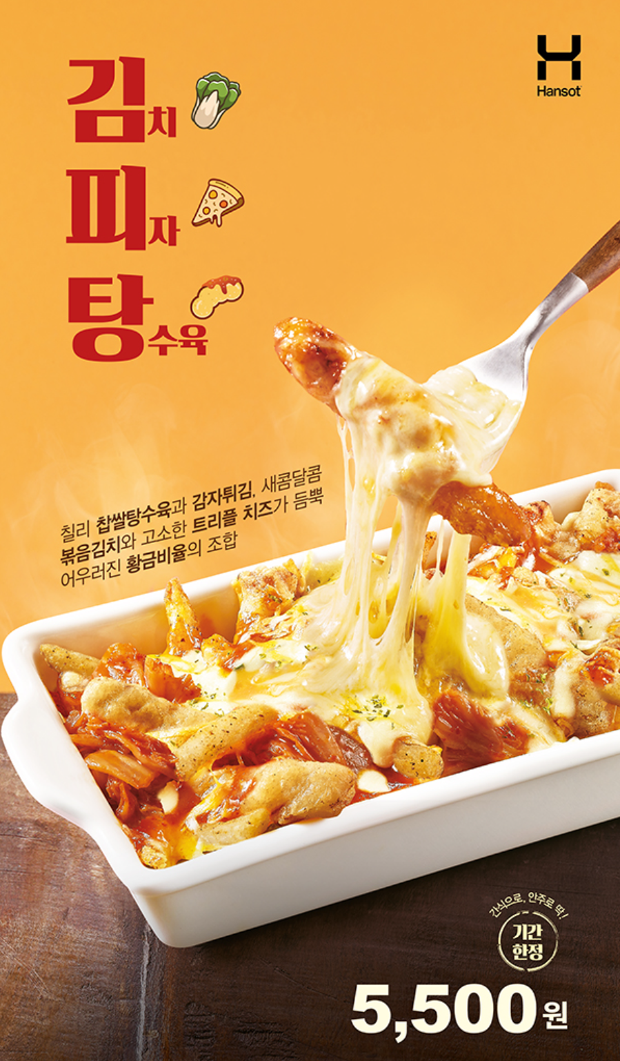 2. 김피탕 (김치 피자 탕수육) - 칠리 찹쌀탕수육과 감자튀김에 새콤달콤 볶음김치와 고소한 트리플 치즈가