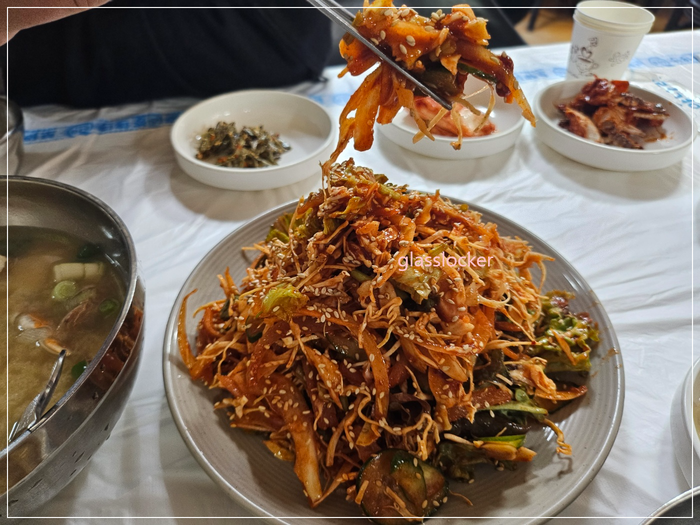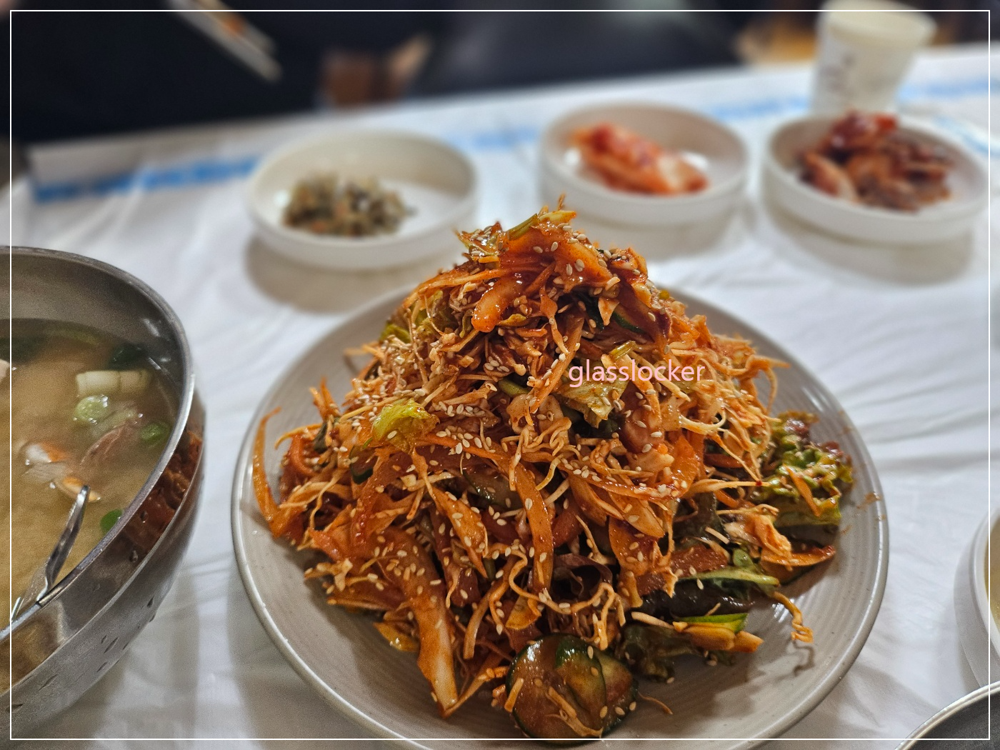 안에는 이미 꽉 차 있어서 내부 모습은 사진으로 담을 수 없었음. - 앉자마다 주문을 하면 반찬이 나옴