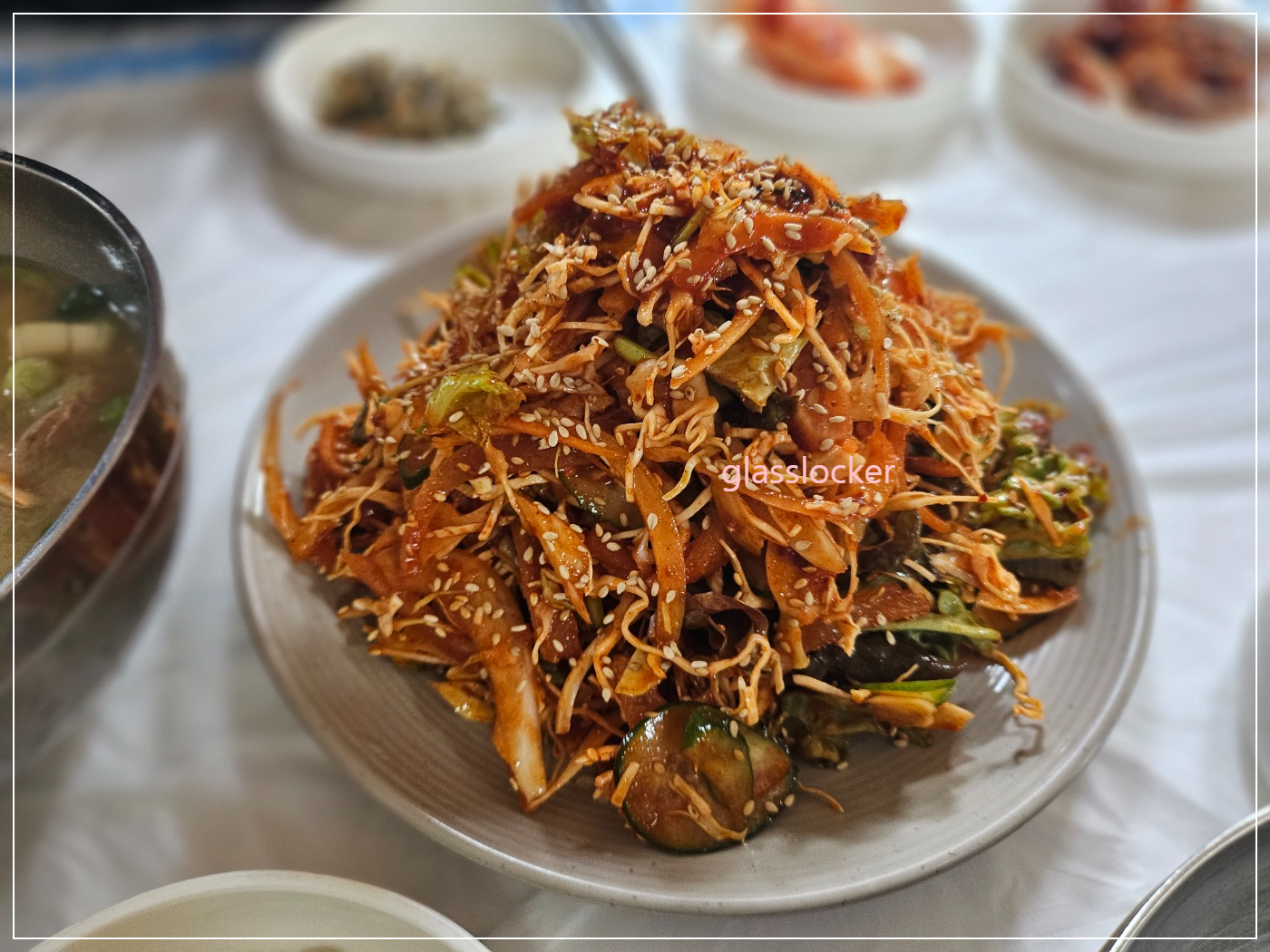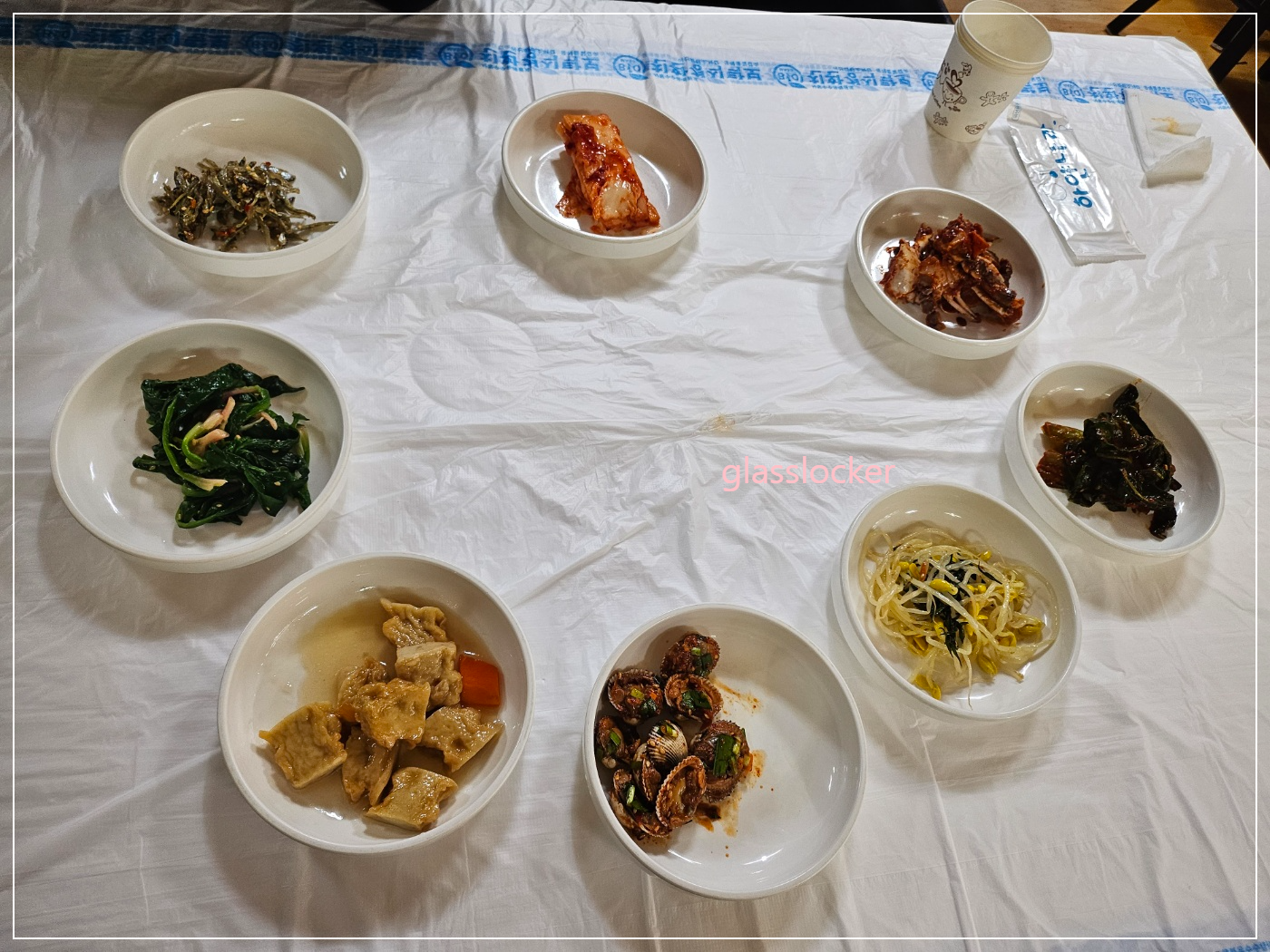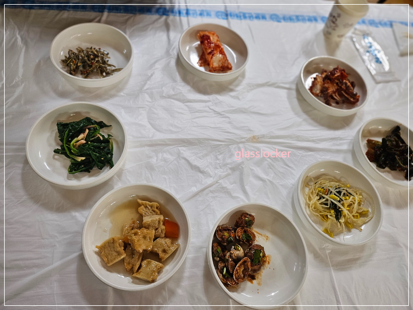 - 시금치, 멸치볶음, 오뎅, 콩나물, 배추김치, 꼬막 등 평범한 백반집의 반찬 모습이지만