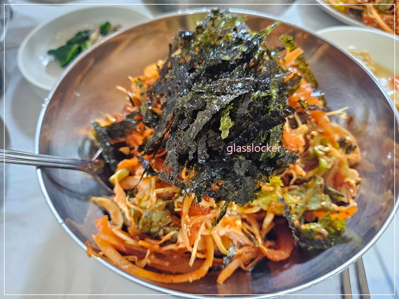 밥 한공기에 서대회를 올리고, 테이블에 있는 참기름과 김가루를 올려서 비벼줍니다.