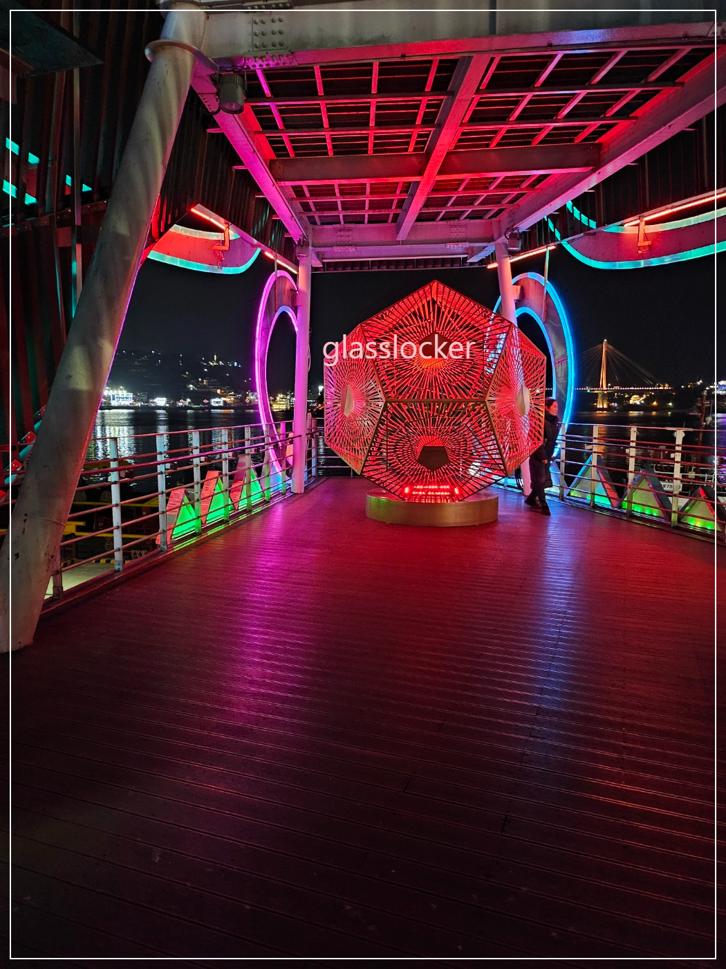 밤에 바라본 거북선과 이순신광장의 다리 내부 모습