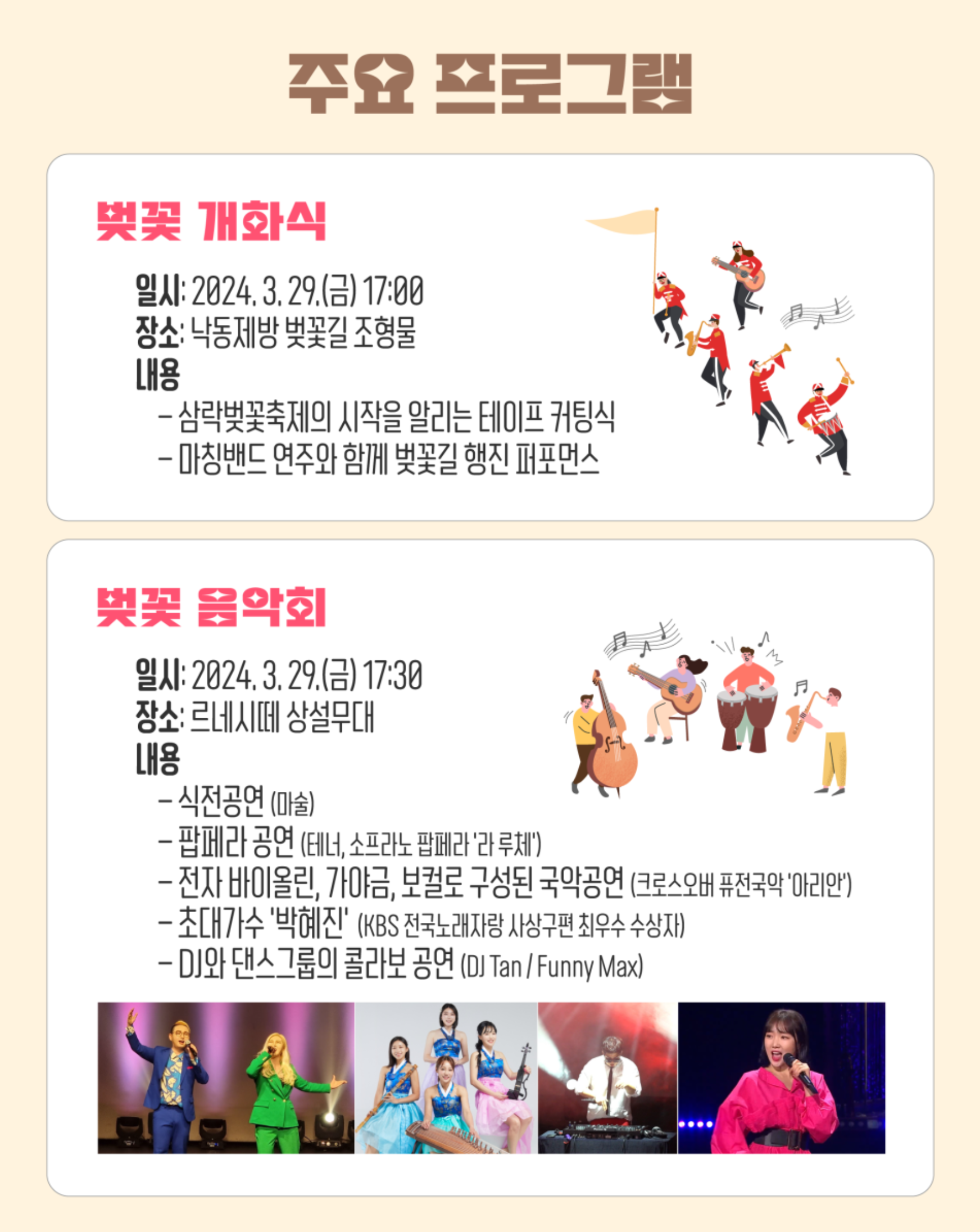 - 기간 : 2024. 3. 29.(금) ~ 3. 31.(일) ※ 벚꽃음악회: 3. 29.(금) 17:30 르네시떼 야외무대