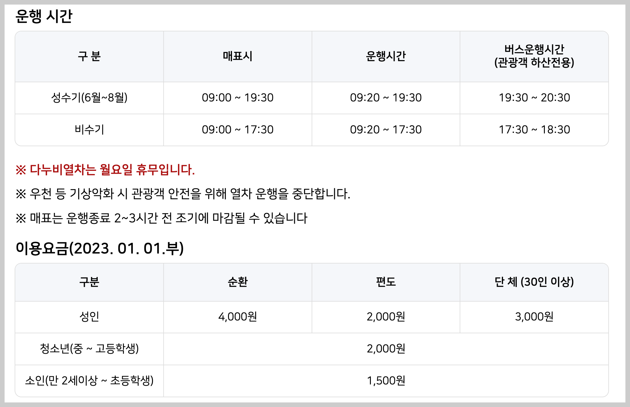 - 유람선 : 성인(10,000원) / 소인(5,000원)