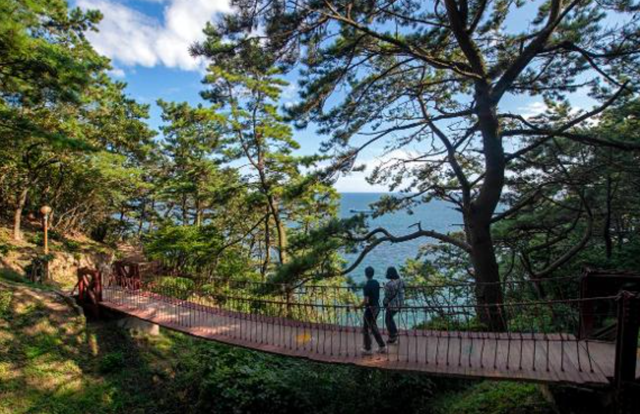 송도 용궁 구름다리 - 한때 최고의 휴양지로 소문난 송도는 옛날에는 신혼여행으로도 인기 있었습니다. 이제는 제2의 전성기를 맞이했습니다! 구름다리가 복원되고 개통되면서 옛 송도해수욕장의 4대 명물의 조각이 모두 완성되었다고 해요. 바다를 건너는 구름다리는 '행운의 열쇠' 모양으로 사랑을 이어주고 행운을 부르는 다리라고 합니다. 밤에는 황금빛으로 물들어 더욱 아름답다고 하니 소원을 빌며 구름다리를 건너보세요! 나무계단을 내려오면 철망바닥이 시작됩니다. 약간의 출렁거림을 느낄 수 있지만 안전하니 걱정 마세요! 직접 다리를 건너면 입구에서 보는 것과는 또 다른 기분을 느낄 수 있어요. 송도의 지질이 이렇게 특이하고 아름다웠던지 새삼 느끼게 되는 시간이에요.