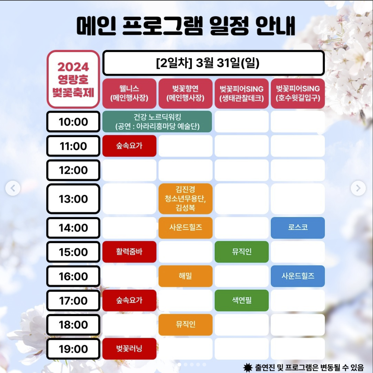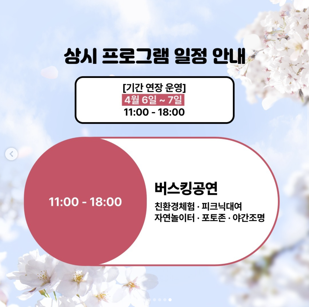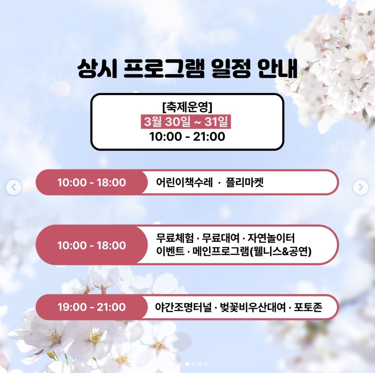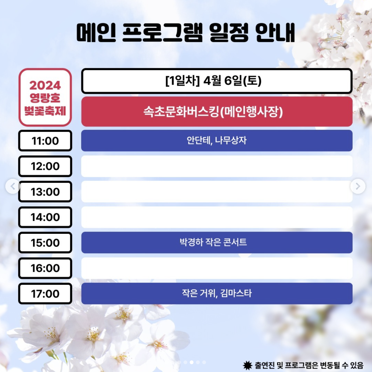 ★ 벚꽃축제의 연장 결정은 날씨의 변화에 따른 대처책으로, 축제를 기다리는 관객들에게 더 좋은 경험을 선사하기 위한 노력으로 이해해 주시길 바랍니다. 함께 아름다운 벚꽃 아래서 즐거운 시간을 보내시길 바랍니다.