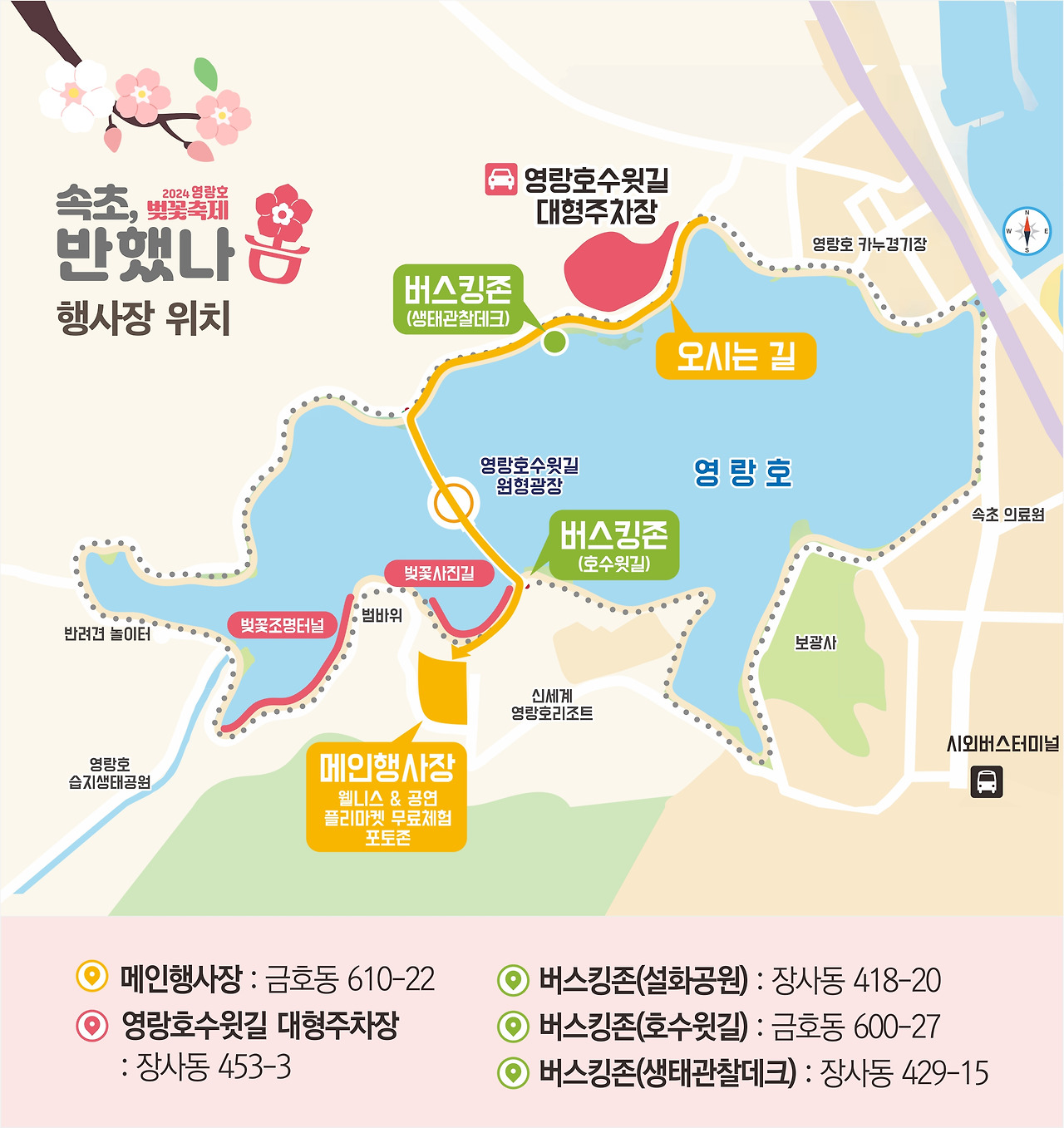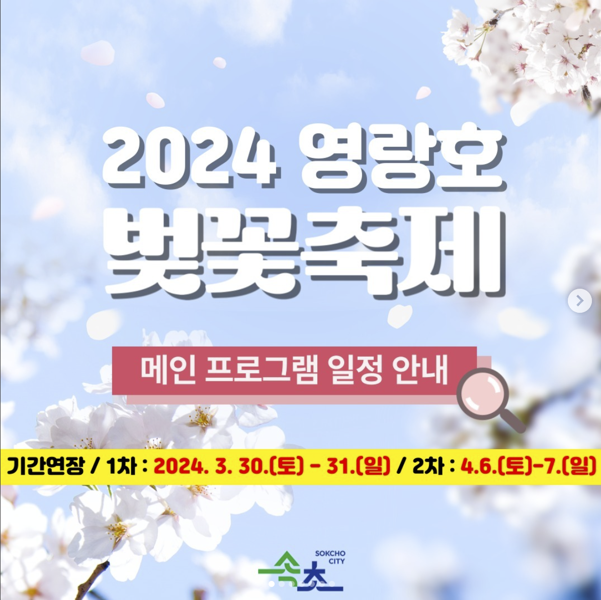 | 기간 : ✔️ 1차 : 2024년 3월 30일(목) ~ 3월 31일(금) ✔️ 2차 : 2024년 4월 6일(목) ~ 4월 7일(금) 장소: 🚗 강원도 속초시 영랑호 일원 축제정보: ✔️ 1차 : ✅벚꽂 야간조명 터널 ✅벚꽂비 우산대여 ✅벚꽂 포토존 ✅플리마켓 ✅어린이책수레 등 ✔️ 2차 : ✅친환경체험 ✅버스킹공연 ✅벚꽂 포토존 |