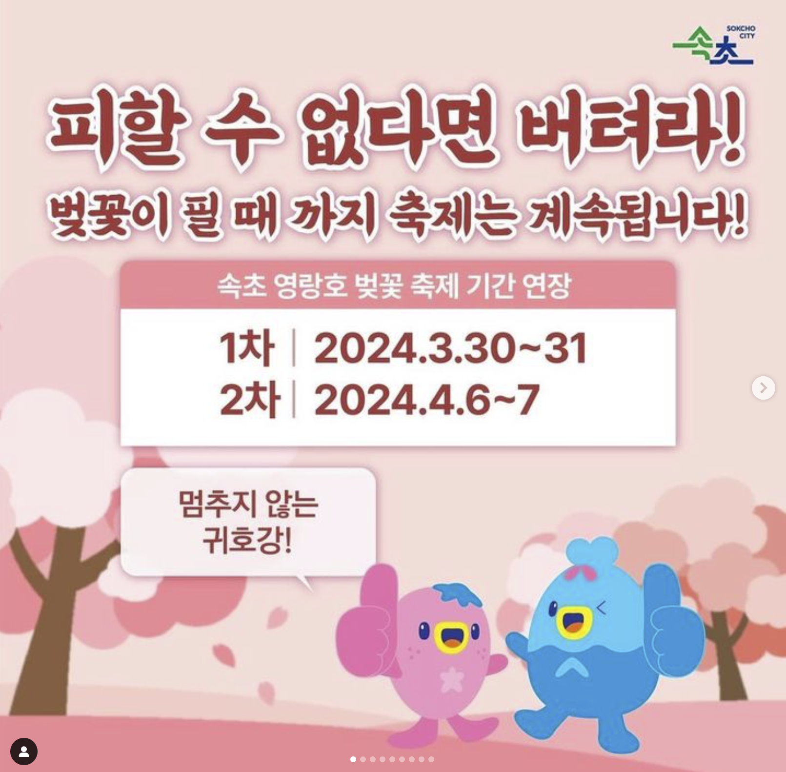 지난 27일, 속초시는 벚꽃축제 연장에 대한 공식 결정을 알리며 공식 소셜미디어(SNS)에 “죽을 죄를 지었습니다. 하늘을 이길 수가 없습니다”라면서 “벚꽃이 안 핍니다. 그래서 영랑호 벚꽃축제 2번 합니다”라고 밝혔습니다.