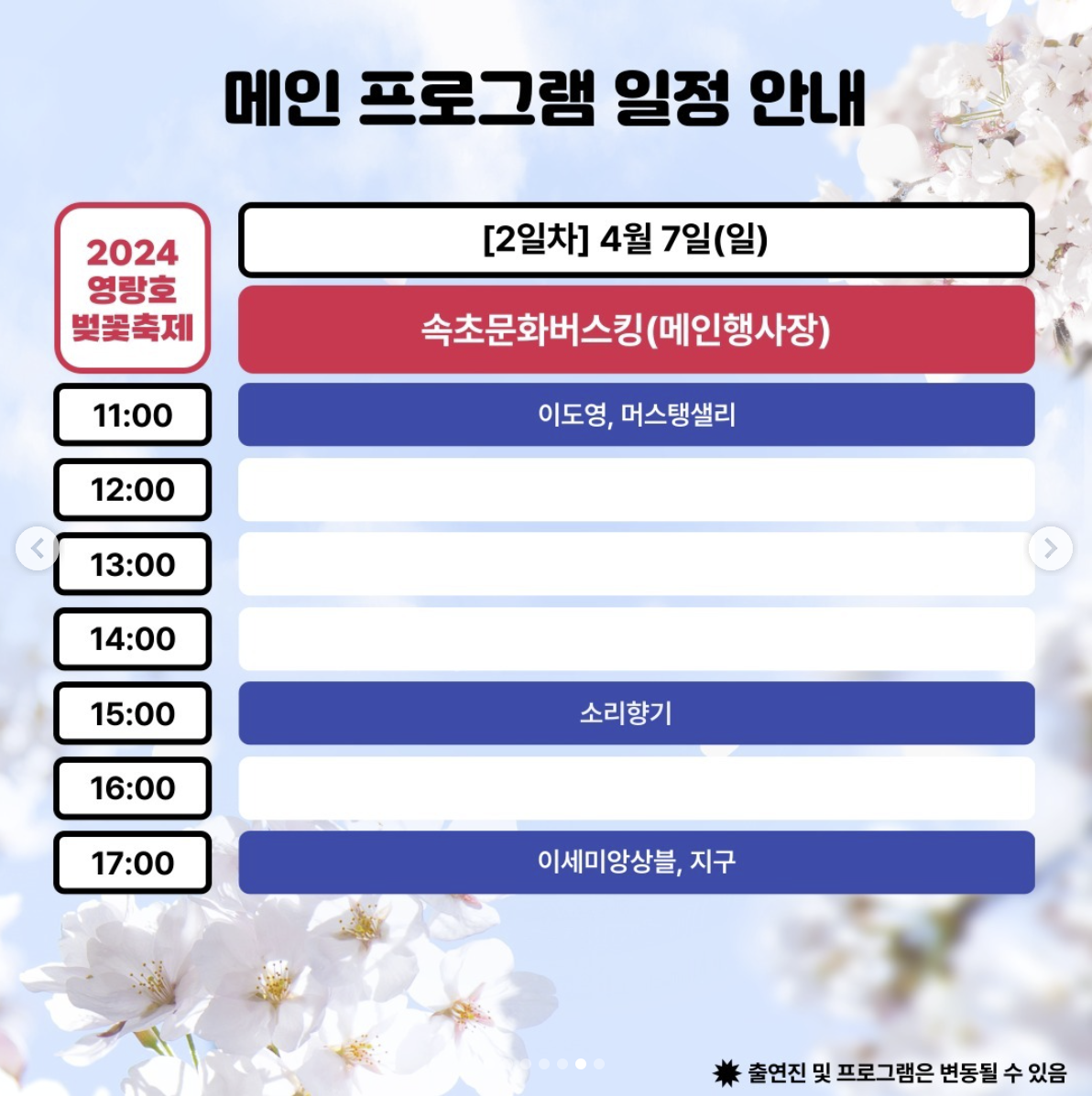 기존에 예정되어 있던 3월 30일부터 31일까지 열리는 ‘2024 영랑호 벚꽃축제’는 여전히 계획대로 진행될 예정입니다. 그리고 이후에도 한 번 더의 축제가 예정되어 있습니다. 예상되는 벚꽃 만개일인 4월 6일부터 7일까지는 추가적인 프로그램들이 마련될 예정이며, 포토존과 야간 조명존 뿐만 아니라 친환경 체험과 버스킹 공연 등도 준비되어 있습니다.