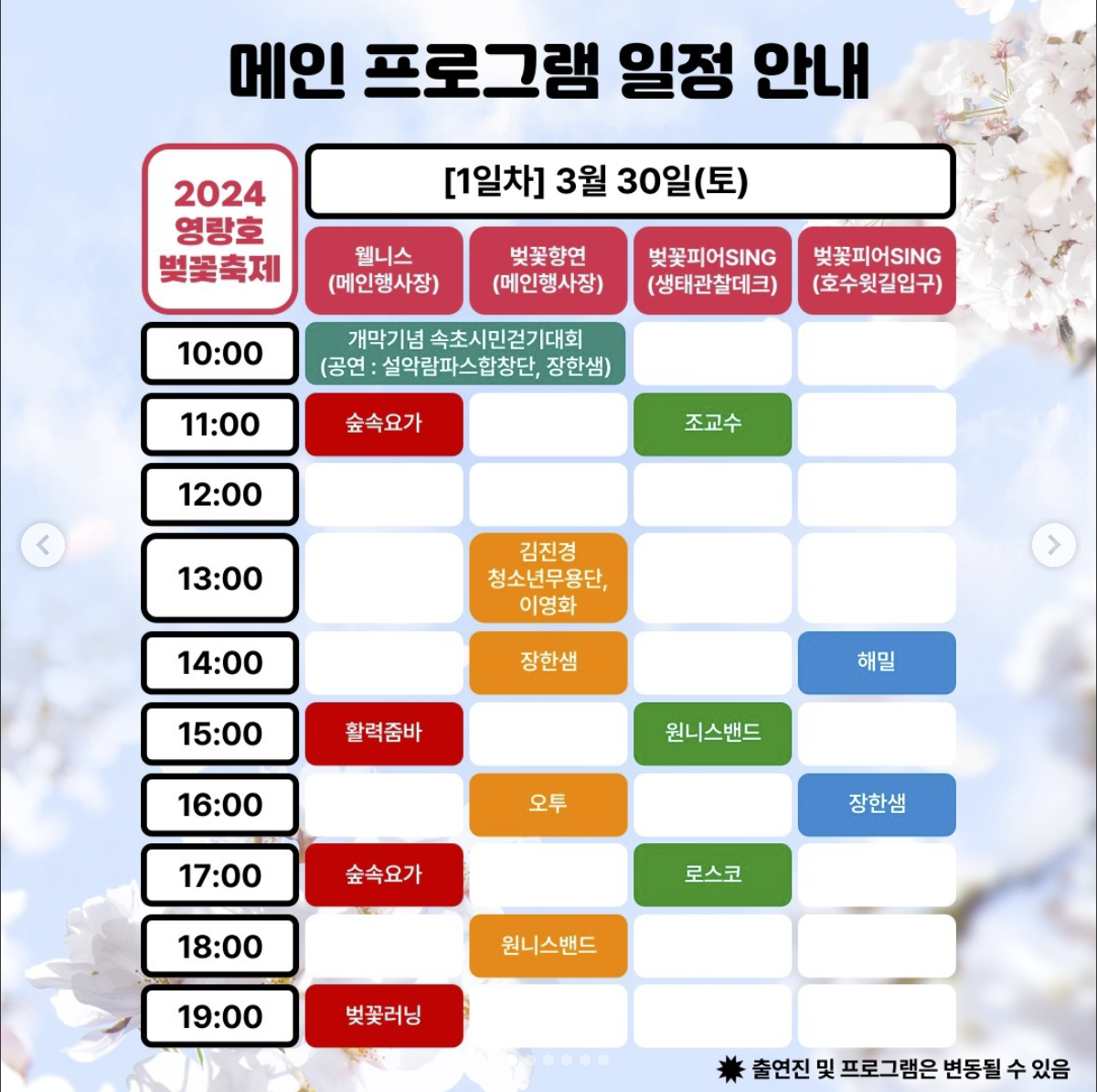 ★ 벚꽃축제의 연장 결정은 날씨의 변화에 따른 대처책으로, 축제를 기다리는 관객들에게 더 좋은 경험을 선사하기 위한 노력으로 이해해 주시길 바랍니다. 함께 아름다운 벚꽃 아래서 즐거운 시간을 보내시길 바랍니다.
