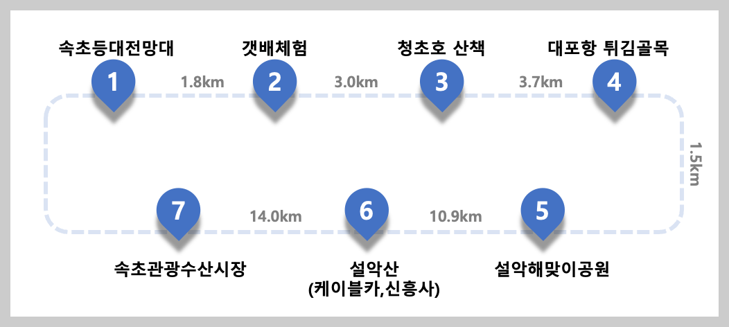 마지막으로 다시 속초해수욕장과 바다향기로로 돌아와 대포항 전망대에서 하루를 마무리하세요. 풍부한 자연과 문화를 만끽하며 즐거움 가득한 여행을 즐겨보세요!