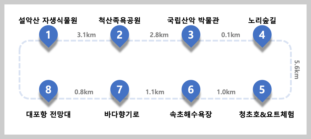 ✅ 설악산 자생식물원 - 설악산 휘귀식물을 관람하기 좋은 곳 ✅ 척산족욕공원 - 지하 450m에서 나오는 온천수로 족욕하며 여행의 피로를 풀기에 좋은 곳 ✅ 국립산악 박물관 - 우리나라의 등산 역사와 등산 문화를 한 눈에 볼 수 있는 곳 (실내암벽등반 가능) (자세한 안내 클릭) ✅ 노리숲길 - 국립산악 박물관 뒤쪽에 위치, 피톤치드를 마시며 산림욕을 즐길 수 있는 곳 ✅ 청초호&요트체험 - 청초호 호수공원 내에 요트 탈 수 있는 레저스포츠 시설(야경이 예쁜 호수로 핫플레이스) ✅ 속초해수욕장 - 속초 고속버스터미널에서 도보 5분거리, 속초 시내와 가깝고 관광객들의 발길이 끊이지 않는 곳 ✅ 바다향기로 - 전망대에서 인생샷을 찍을 수 있고, 경사가 낮아 어린이와 나이드신분들도 산책하기에 좋은 곳 ✅ 대포항 전망대 - 대포항 뒷산 산책로로 대포항과 설악산의 울산바위가 한눈에! 가볍게 산책을 하면서 주변 멋진 풍경도 보면 일석이조! |
