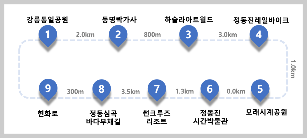 | ✅ 강릉통일공원 - 국군의 군사장비와 북한잠수함 등을 볼 수 있고 대통령 전용기는 내부관람도 가능한 곳 - 주변 관광지 : 정동진해수욕장, 모래시계공원, 조각공원 ✅ 등명락가사 - 우리나라의 정동 쪽, 동해 일출을 가장 아름답게 감상할 수 있는 절. ✅ 하슬라아트월드 - 뮤지엄호텔, 야외조각공원, 현대미술관, 피노키오박물관, 레스토랑, 바다카페가 있는 복합문화공간. - 다양한 예술작품과 프로그램 체험 가능, 아름다운 자연을 함께 감상할 수 있는 곳.(예약 및 안내 클릭) ✅ 레일바이크 - 정동진역을 출발해 전 구간 시원한 바다 경치를 즐길 수 있도록 운행되는 바이크로 2인승과 4인승이 있음. (안내 클릭) ✅ 모래시계공원 - 드라마 모래시계와 새천년 밀레니엄을 기념해서 만들어진 공원으로 하지때 일출 명소로 유명한 곳. ✅ 시간박물관 - 모래시계공원내 해변에 위치,연간 20만명이상 관람하는 매력적인 박물관으로, 증기기관차과 객차 7량으로 조성되어 있어 시간여행 하는 느낌을 주는 곳. 기차지붕 바다전망대에서 정동진 바다를 내려다 볼 수 있음. (안내 클릭) ✅ 썬크루즈 리조트 - 정동진 천혜의 해안절경에 위치하고 있는 세계 최초의 육상 크루즈 리조트. (예약 및 안내 클릭) ✅ 정동심곡 바다부채길 - 정동진∼심곡항(헌화로)을 잇는 2.86㎞ 구간에 2016년 9월부터 개방되는 탐방로가 조성되어, 솟아오른 해안단구로 부서지는 정동진 해변의 파도가 만들어내는 절경을 가까이에서 볼 수 있는 곳. (안내 클릭) ✅ 헌화로 - 사계절 다양하고 새로운 모습의 자연절경으로 관광객이 추억을 쌓기 위해 많이 찾는 장소로, 강릉의 필수 드라이브 코스로 유명. |