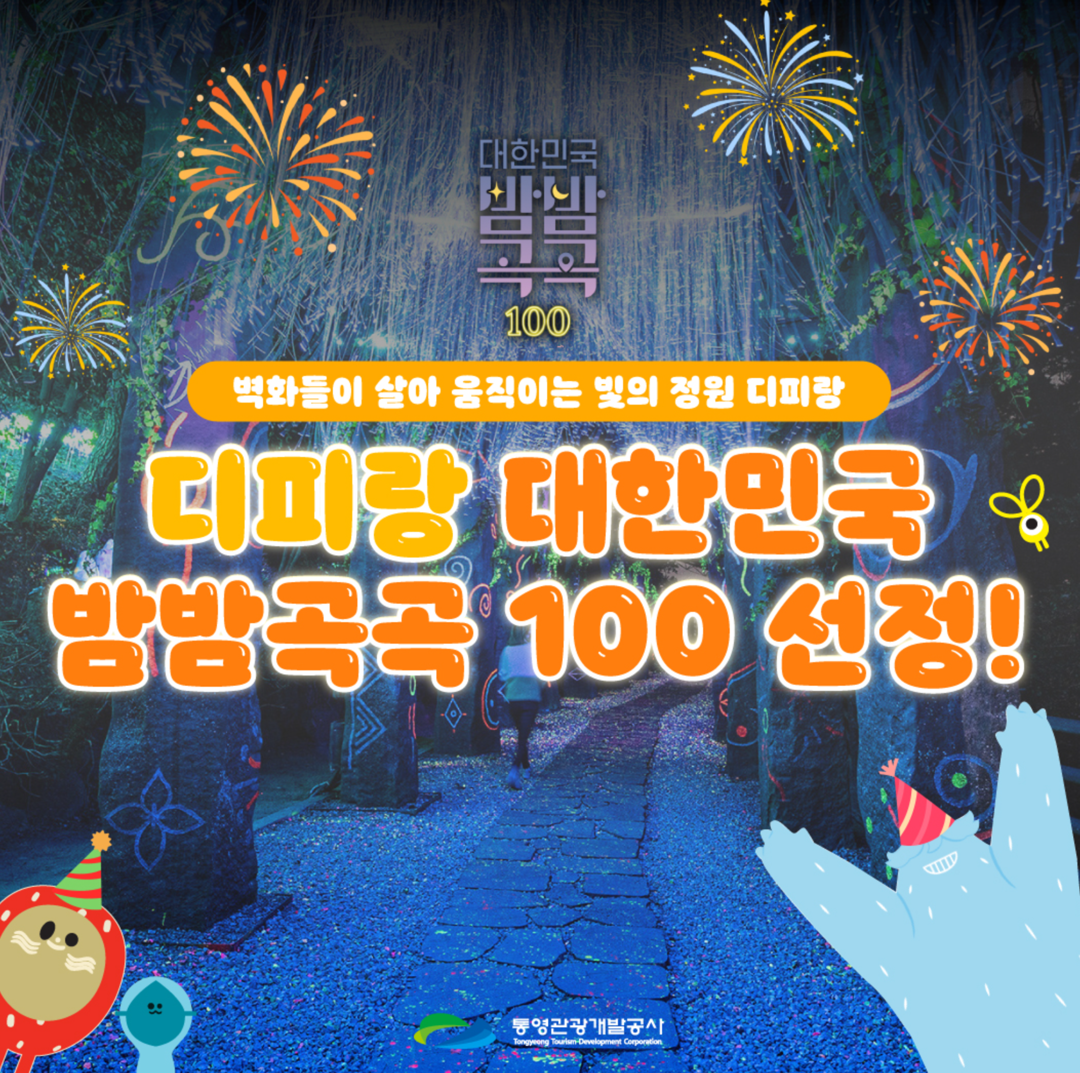 대한민국 제 1호 야간관광 특화도시 통영의 대표적인 야간관광지인 디피랑은 국내 최대의 야간 디지털 테마파크입니다. "벽화마을 동피랑과 서피랑에서 지워진 벽화는 어디로 갔을까요?" 라는 컨셉으로 동피랑과 서피랑에서 2년에 한번씩 새로운 벽화를 그릴 때 사라지는 작품을 미디어 아트로 되살려 놓았습니다. 남망산 조각공원 산책로를 따라 1.5km의 구간에 펼쳐지는 화려한 미디어 파사드와 미디어 아트를 신비한 음악과 함께 즐길 수 있습니다.